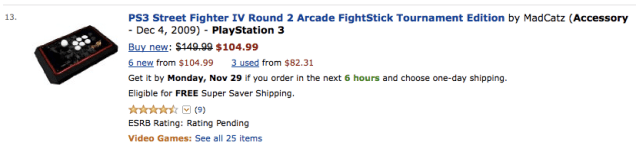 I’m really excited to be getting a TE for PlayStation 3 at a reasonable price. My girlfriend looked at me funny when I chose a Mad Catz TE over a PS3 as a birthday present a few months back, but I love the heck out of the one she got me. It was easily one of the best birthday gifts ever. Having used a number of fightsticks now, nothing comes close to the experience I’ve had with my TE. Getting one for PS3 ensures that I will be able to beat down my coworkers with no excuses (or lose with less excuses) and that I’ll be able to enter any Street Fighter tournament without having to worry about sketchy converters or dual-modding. If you’re a Canadian looking to get a Mad Catz TE fightstick, Amazon.com is probably the way to go.
