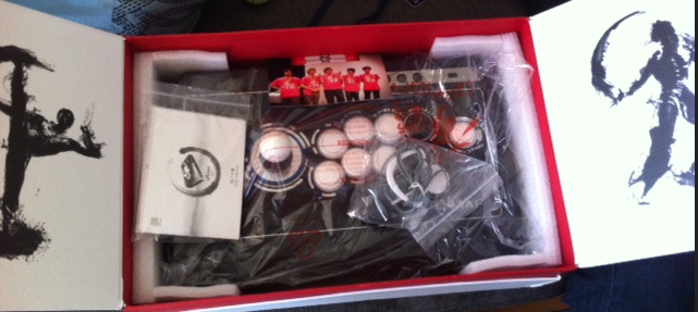 Flip open the flaps and you finally get to see what the box contains. Besides the fightstick itself, you get an XBOX 360 over the ear headset and an instruction manual that’s primarily written in Chinese. Mine also came with a picture of Team Japan 2 from the 2011 Canada Cup, but I’m not sure if that just came with mine because I bought it at this particular tournament.