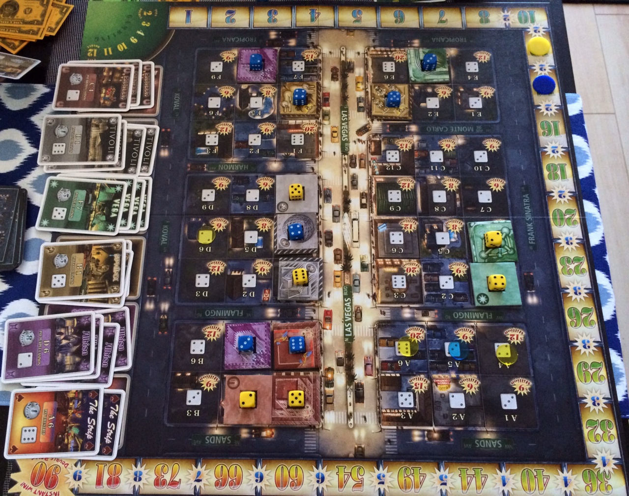 There are a lot of components that make Lords of Vegas tick. Featured on the game board alone are clusters of coded lots that contain dollar and die values. Along three quarters of the edges is a score track with unique intervals as players progress. On the one remaining side are spaces to keep track of all of the cards that have been played.