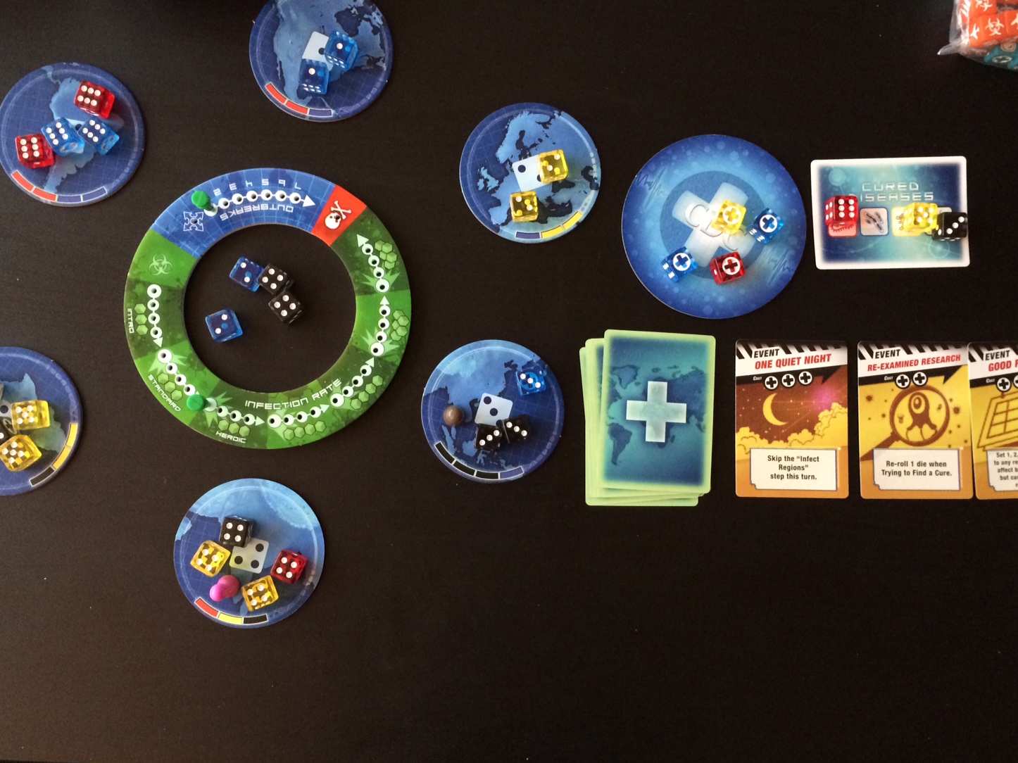 FullSizeRender(1)Unlike the original game, the world map game board has been set aside for a series of modular components. The ring-shaped piece is the Treatment Center. This is used to track the infection rate and outbreaks. Also, the empty space in the middle is used to store disease dice once you’ve treated them from a region. Unlike the board game, which featured dozens of different cities, Pandemic: The Cure simplifies things greatly by only using six regions; each of which have their own little circle. Placed to the side are the CDC headquarters, which is used to store cross dice, event cards that can be bought with cross dice, and a cured diseases card that is used to track your progress.