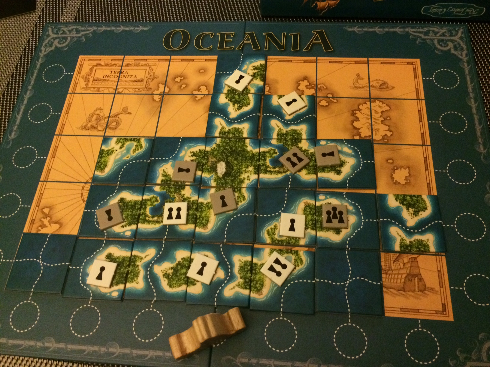 In Oceania, 1-2 players take the high seas in search of new land. Starting with an empty board, players explore this uncharted territory by building the world with randomly-drawn tiles. Along the way, players can place scouts on islands as their bid to take control over them. At the end of the game, the player with control over the most tiles with islands on them wins. Despite its clever design, the game struggles to generate any fun or excitement.