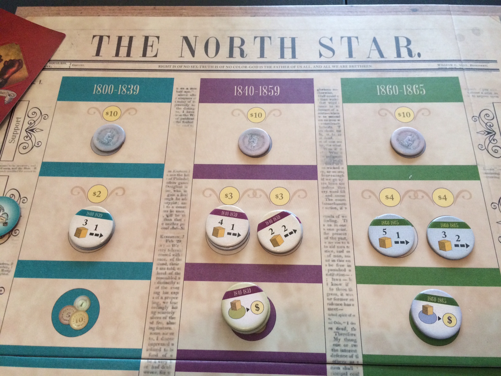 All three sets of tokens are critical to your success, though you’ll never be in a position to get everything you want in one turn. Players are only allowed to collect two tokens each, some tokens cost money, and most tokens are only for one-time use. Making sure that the right players get the right tokens at the right time is key. So far when I’ve played, I’ve been able to complete or come very close to completing the freed slaves winning condition, but consistently fall short of buying all of the support tokens. I guess I’ll need to study more and optimize my approach.