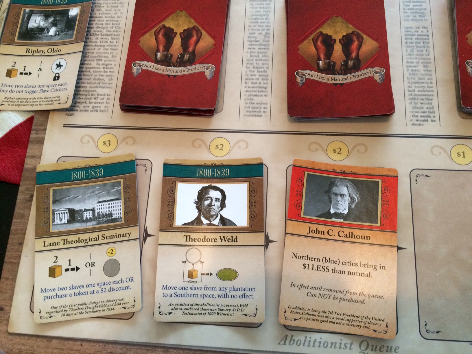 During the Action phase, you can also purchase a from the Abolitionist Queue. All of these cards are based on real-life people and events of the time. Most of these cards also impact the game in a way that makes sense within the context of the game. Some cards give you clear benefits, while Abolitionist Opposer cards actually add a negative affect to the game until you buy them. I find that these cards can be particularly helpful or devastating, depending on where in the queue they are and at what point the negative cards arrive.