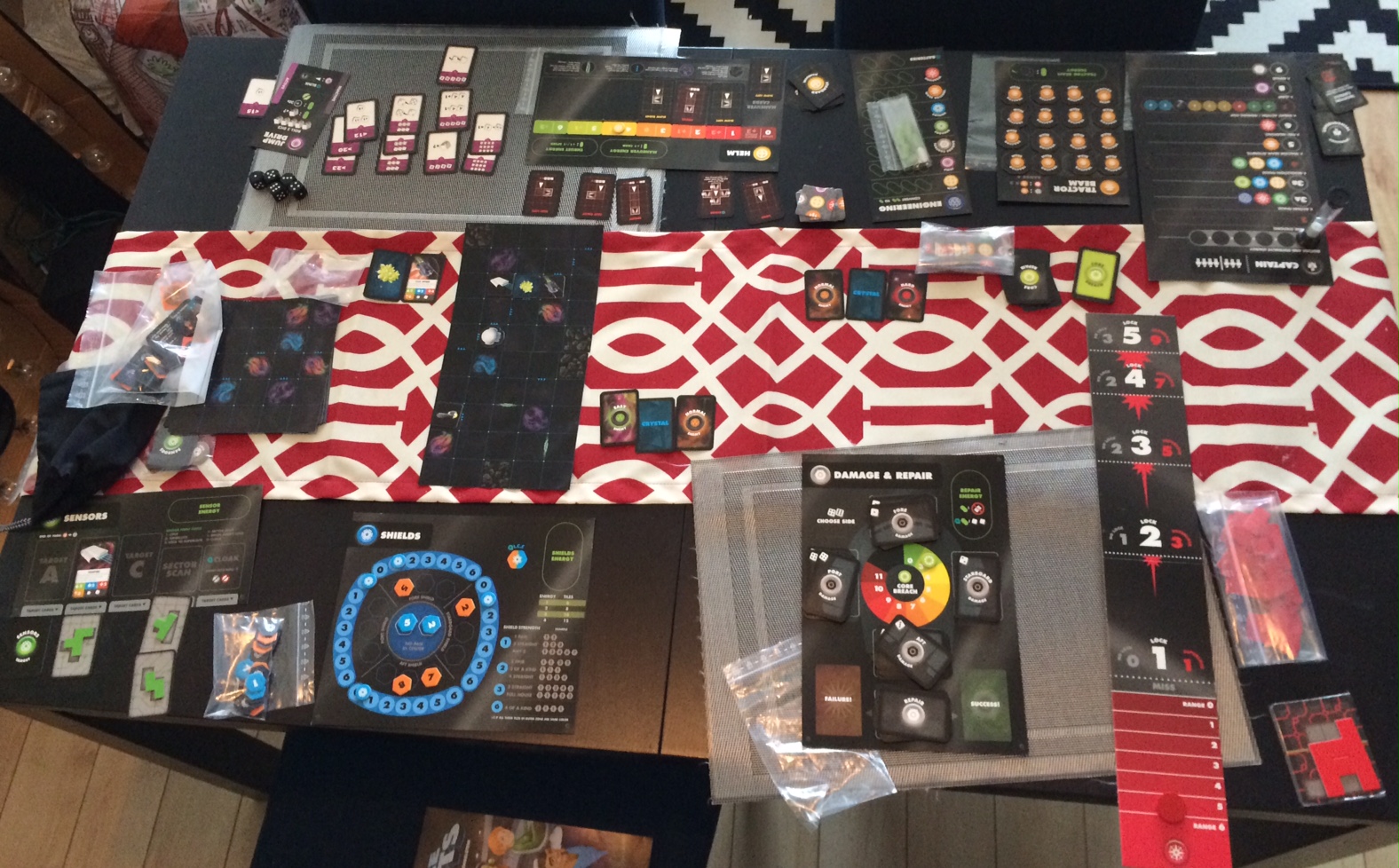 The end of a successful set up will make your table look like a sci-fi dream. Somewhere in the middle of the table should be your map with your ship token and any applicable cards surrounding it. Bordering your table will be all of the individual stations. While the game does allow you to play with only three players, I prefer larger player counts to minimize the number of people that have to manage multiple jobs. By doing so, each person can better concentrate on doing their jobs really well.