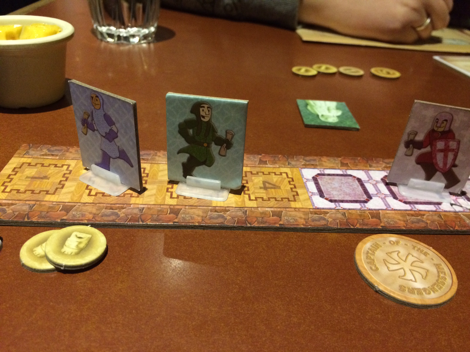 At the start of each round, players start with two messages that serve two purposes. For one, if you reach the throne, the messages you still have on-hand will net you coins based on the value listed on the message. Along the way though, you may want to use your message’s benefit, which may allow you to keep the die after your turn ends, stop another player from moving, add more spaces to your turn or re-roll. You lose the opportunity to score points with that message, but it may ultimately help you reach the throne in a situation where you wouldn’t have made it otherwise. After five rounds, the messenger with the most money wins.