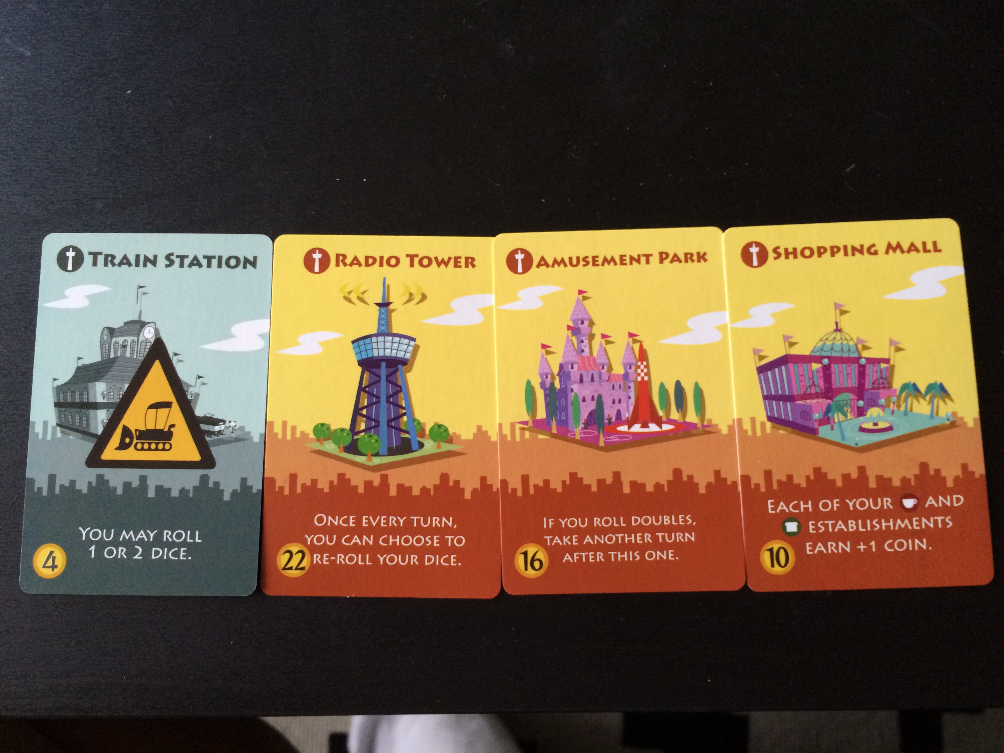 As the game progresses, your city will generate more money, eventually allowing you to complete landmarks. These have a big effect on your progression, as they also unlock huge abilities. As an example, buying the Train Station allows you to roll one or two dice, opening up a new set of higher value cards that aren’t available at the start of the game. The most expensive landmark, the Radio Tower, lets you re-roll your dice once per turn, which can come in very handy.