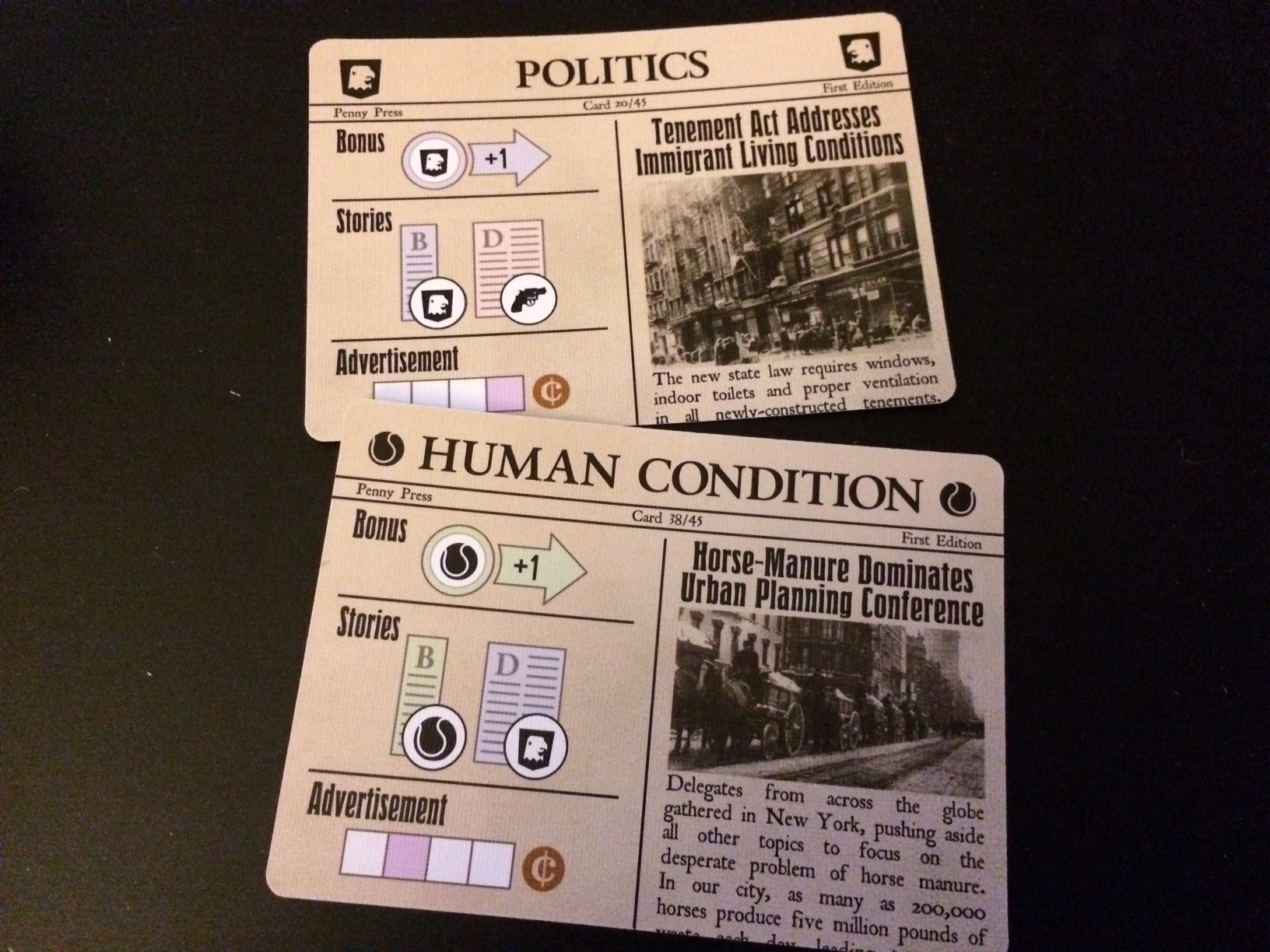 Penny PressIf you have a story in the top news beat, it must touch the top row of your front page. If you have any other stories touching the top row, you can designate one of them to be an exclusive, which is worth double the points. Ideally, you want to build a front page that fills the entire area, as empty spaces and unpublished stories lead to negative points. However, after your first printing, you need to run ads, which usually block off one square in awkward ways. Depending on the what stories are available on the board and where your ad is placed, you’re probably going to run into a situation where you can’t fully cover your board. At this point, you’re going to have to make a judgment call on how to publish your next edition without taking too much of a penalty.