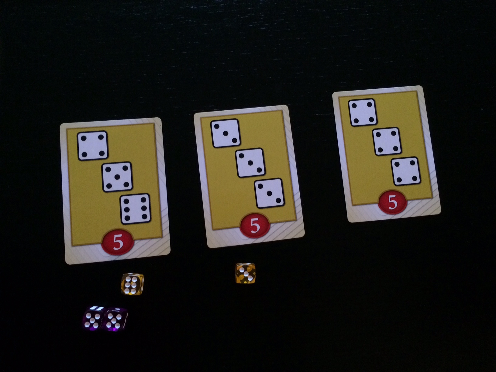 Each player gets a set of six coloured dice. Placed in the middle are three cards that show different dice combinations and corresponding point values. On your turn, you’ll roll your dice and map any matching dice to any combination of cards on the board. In future turns, you’ll roll your remaining dice until you choose to take them all back or you successfully obtain a card by completing the combination.