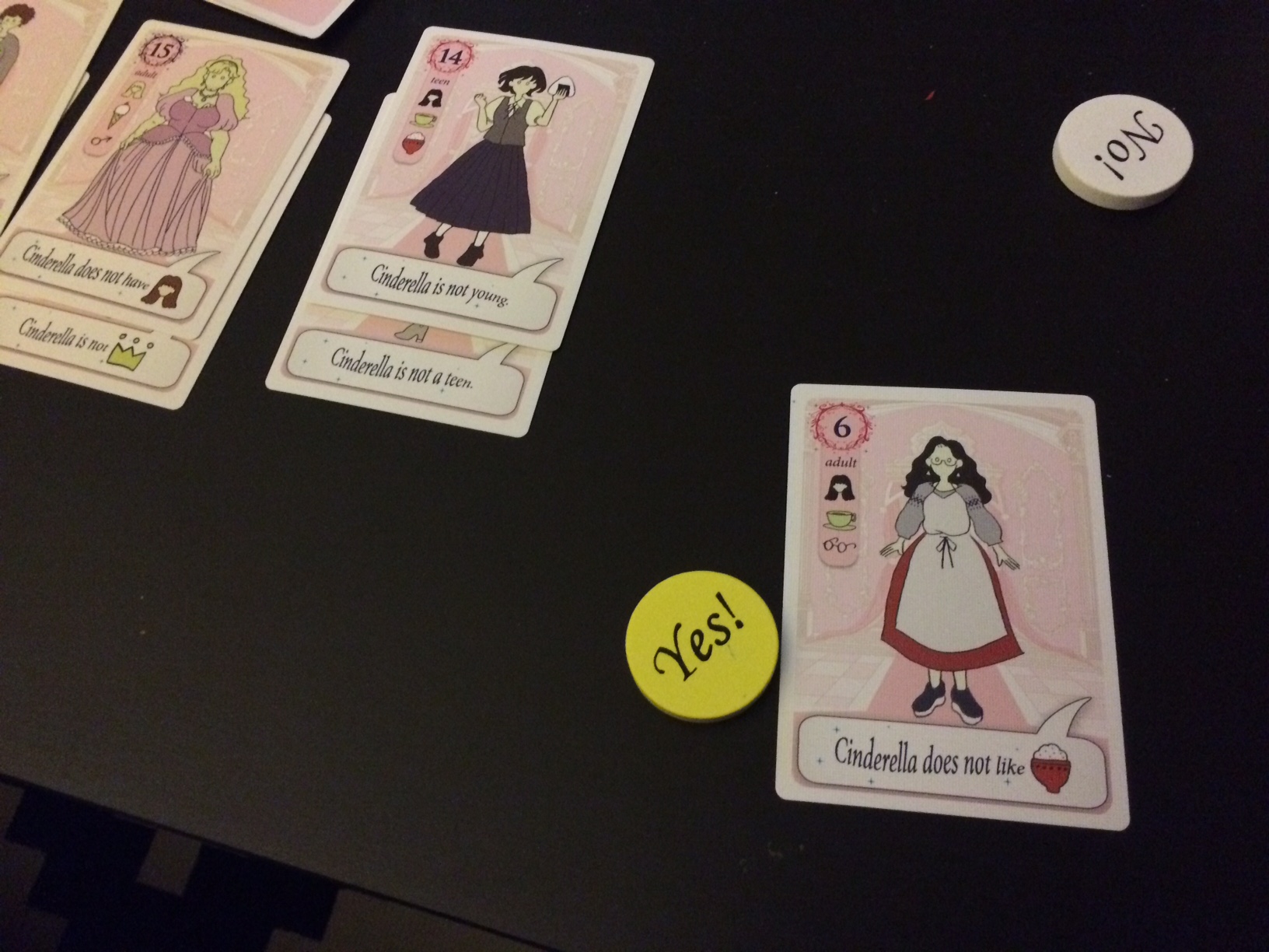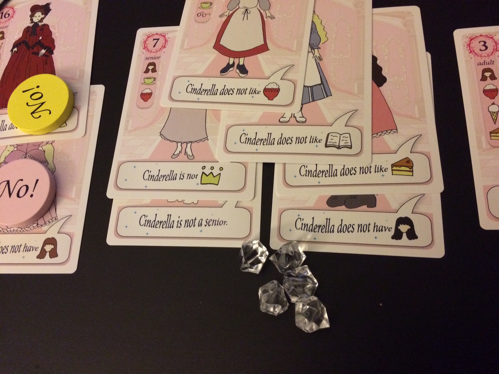 The game is played with a small deck of cards, a set of yes and no tokens for each player and diamonds that are used for tracking score. Each card serves a dual purpose. One, it features a Cinderella candidate, along with her rank, picture and fact file. This is represented with a series of icons that describe who they are, such as their gender, age, hair colour, stature and interests. At the bottom of the card is a rumor, which is activated when the card is played. These rumors will be used to narrow down the description of who Cinderella is.