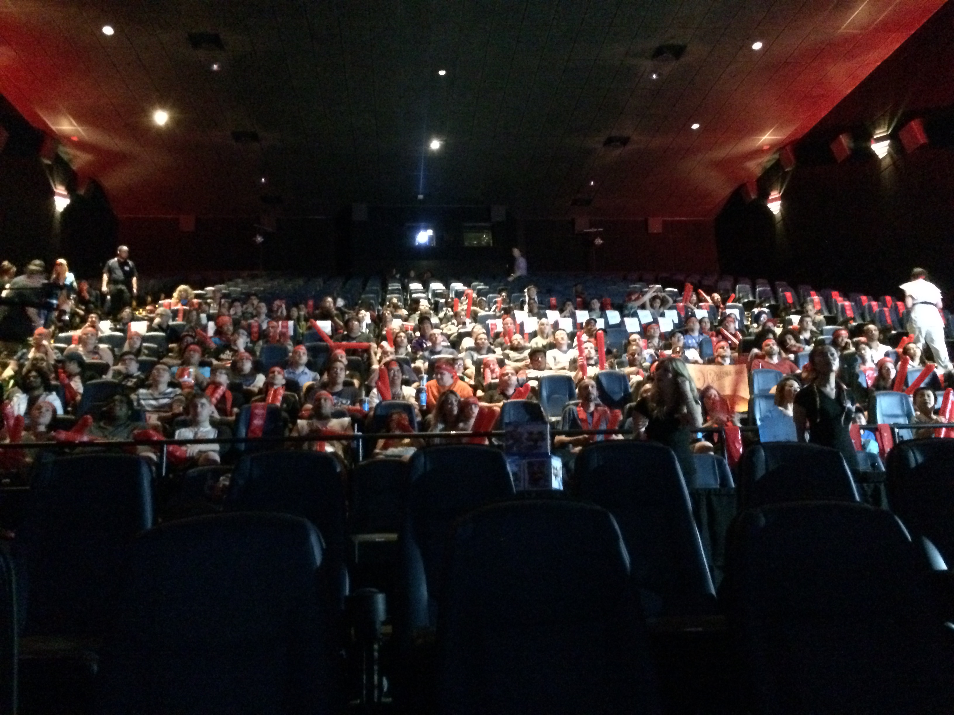At some point after warm-ups, the audience was let in. It was a great crowd that took up about 75% of the theatre by the end of it. They were given thundersticks, plus they were really into the action in general, so the theatre was really loud.