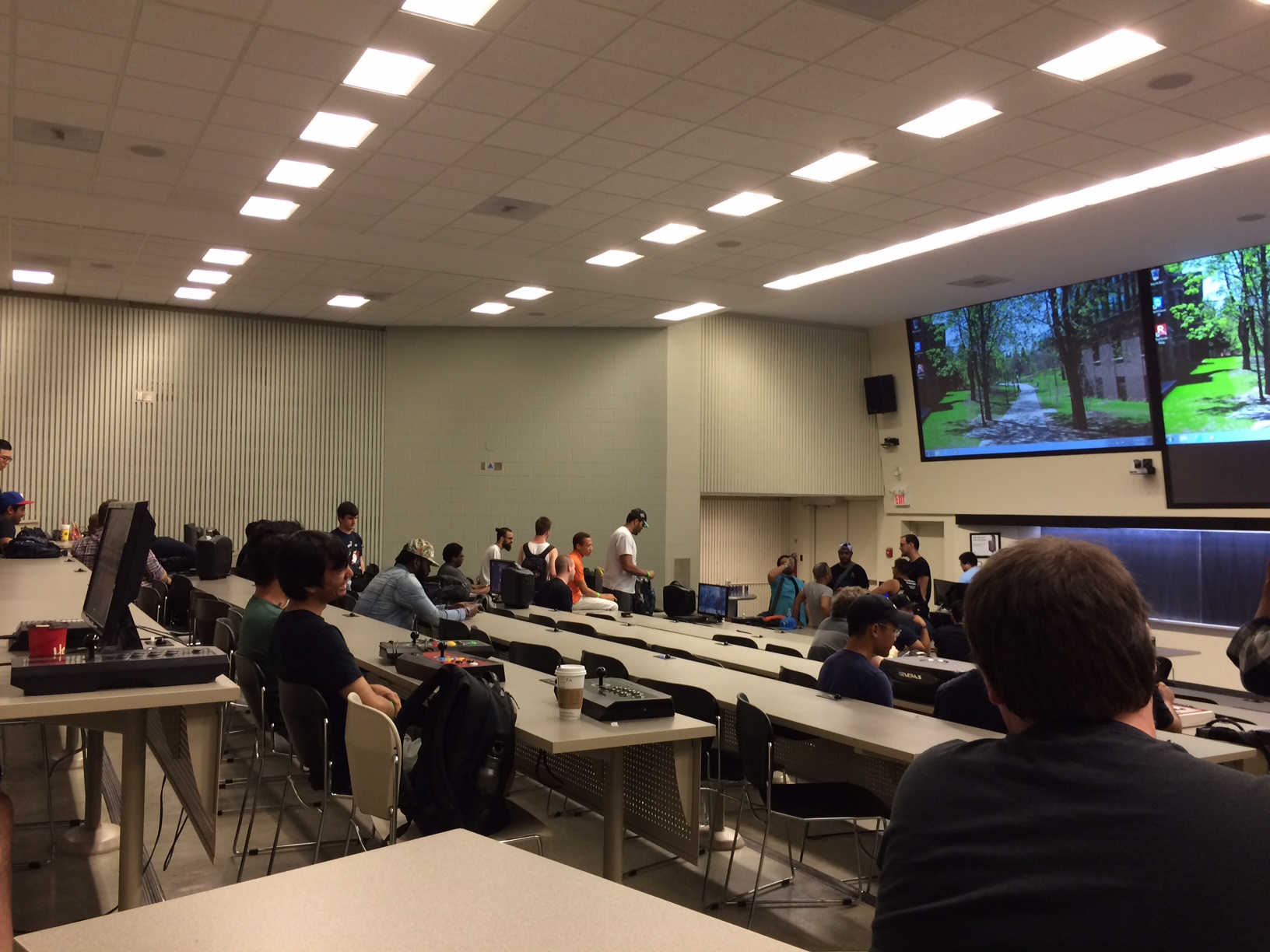 The event took place inside a lecture hall at the University of Toronto. At first, it seems like a strange choice of venue, but for the most part, it works. There are large screens at the front so that spectators can watch all of the streamed matches. The lecture booth can be used to call out which players should go to which stations. Then all of the desks have outlets, allowing for the easy setup of televisions and consoles.