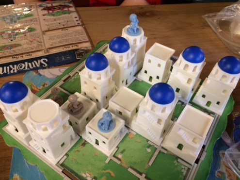 Santorini is a gorgeous game. The main board sits atop a stand that makes it look like its a raised island. Each worker figure is detailed. Most impressive are the building blocks, which form intricate buildings with clearly defined windows and stairs.