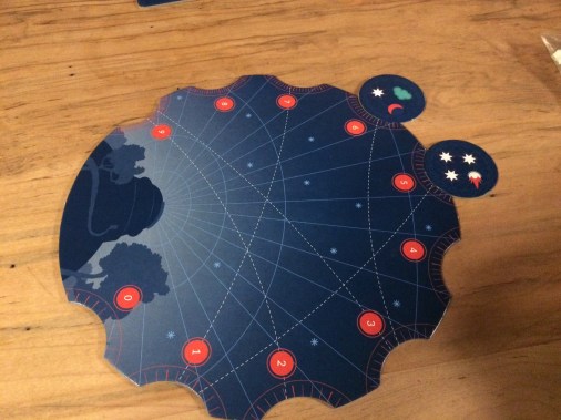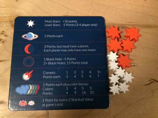 At the centre of the table is the circular board, which represents the sky. It features notches valued from 9 to 0. Filling those notches are tiles that feature any combination of stars, planets, comets, clouds, moons and black holes. Each element scores points in different ways.