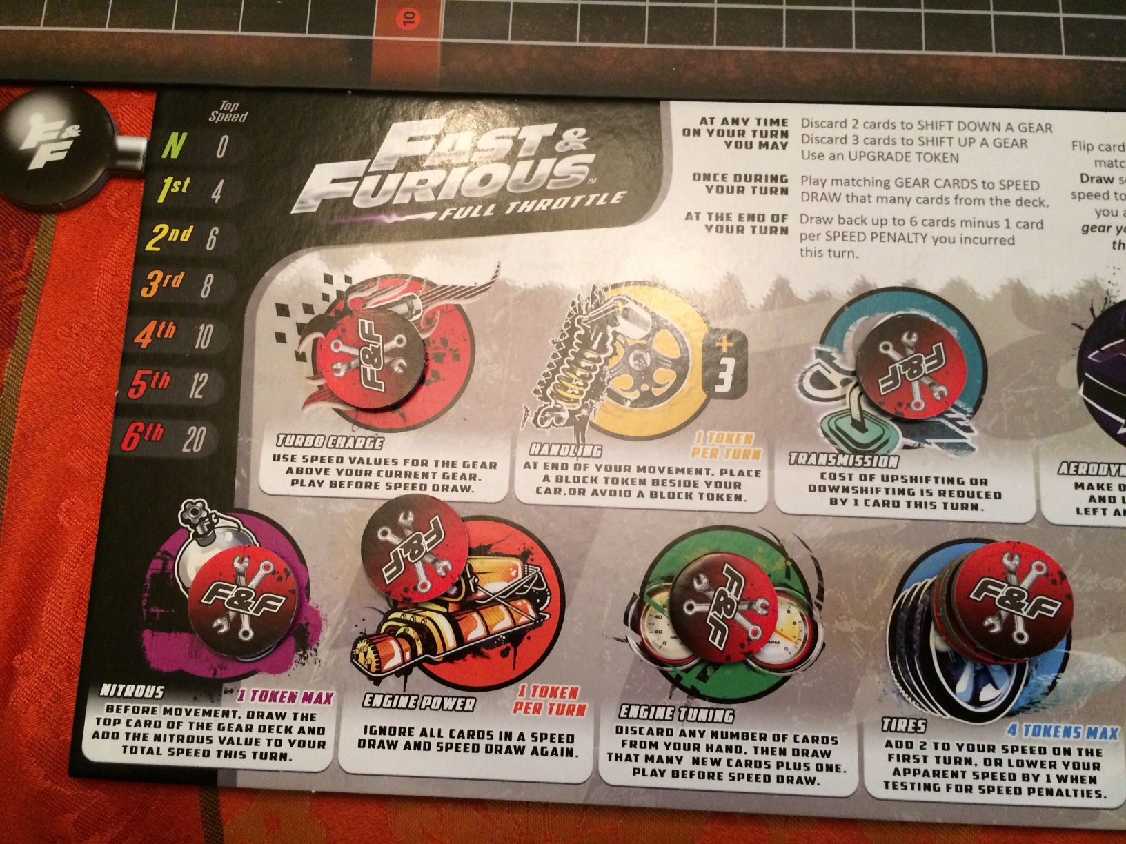 Each player will place their car token on the starting line and have a few things in front of them. They’ll have a hand of six cards that will control gear shifting and movement, as well as a dashboard that displays what gear you’re in and what mods you have available to you. For advanced players, you can even use character cards that let you play as one of 12 different characters from the movies, which also give you a unique player power.