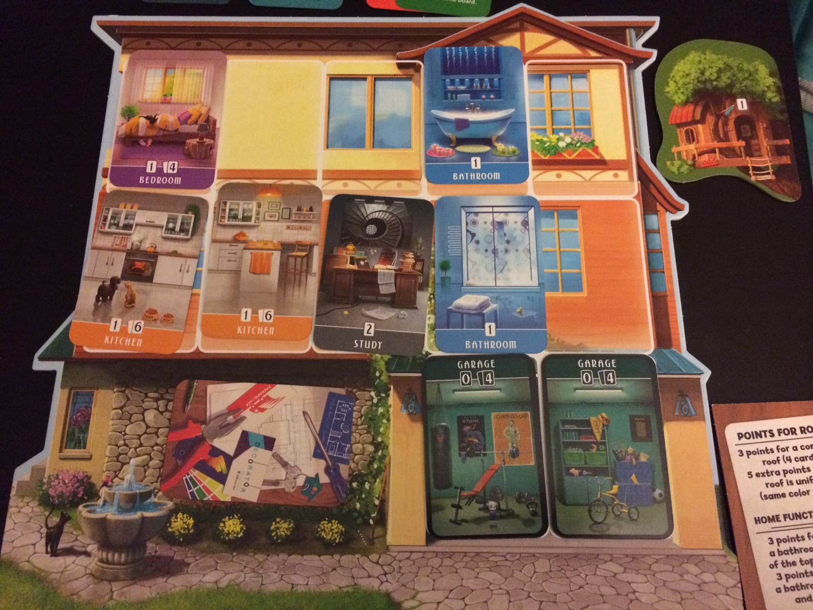 One-to-four players will be tasked with building the most valuable home. Value is based on a number of factors, such as the types of rooms you have, the size of certain rooms, how each room has been decorated, the completeness and uniformity of the roof, as well as the functionality of the house. At the start of the game, everyone will start out with an empty home featuring spaces to fill a main floor, upstairs, basement, and roof. By the end of the game, it will be built up to the best of your abilities and the player with the most points wins.