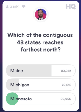 By the time it reached question 7 or 8, I had found it odd that there hadn’t been a “Savage Question”. In layman’s terms, a “Savage Question” is one where the majority of players gets it wrong. While the savagery came late, it certainly lived up to its name. Asking players which of the contiguous 48 states reaches farthest north, over 100,000 out of 122,000 players got it wrong.