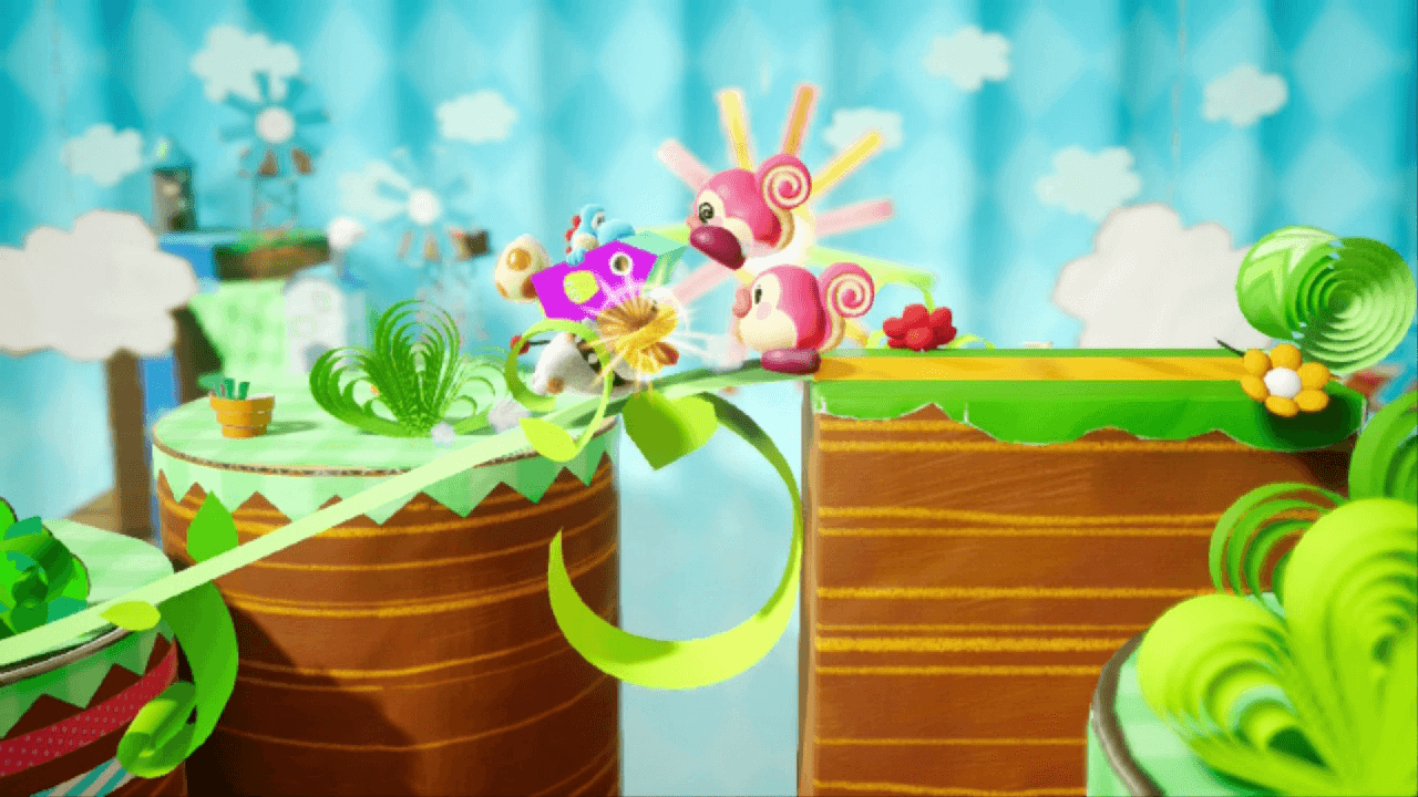 Crafted World takes Yoshi into the next dimension. While it’s not a fully 3D experience, Yoshi can move along paths that go into the screen. Yoshi can also shoot eggs to hit targets in the foreground or background. The added depth certainly gives the game a distinct look on top of its elementary school art project art direction. There’s one scene where a train is spiraling upwards and it looked really neat. In other moments, you’re required to search more open-ended spaces for objects to complete a train or a bridge to move forward. It’s a nice touch to be able to move along a slightly-less linear path.