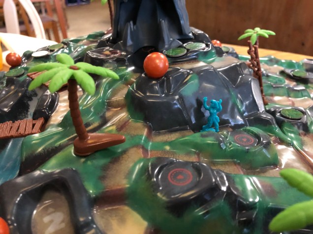 As you would expect from a game with the Fireball Island name attached to it, The Curse of Vul-Kar is played on a 3D plastic board. This time, Restoration Games has gone to great lengths to add to the immersion while adding new wrinkles to the game. The new board is actually three pieces interlocked together to create one massive board in terms of width and height. Plastic trees are inserted in key spots on the board, but they’re not just decorations. They also act as bumpers that can alter the trajectory of incoming fireballs.