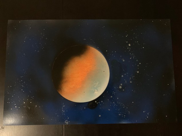 One of the mistakes we made occurred before we even began painting. We took advantage of a sale on canvases at Michael’s, but realized after the fact that this wasn’t the best surface to spray on. The porous fabric requires a lot of paint to cover. You can see it in this first attempt that the black coverage is thin and the colour saturation on the planet isn’t as vibrant as I would have wanted it to be.
