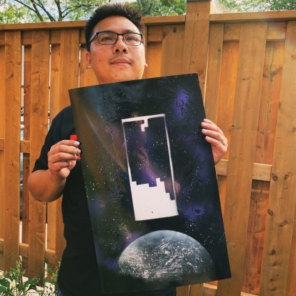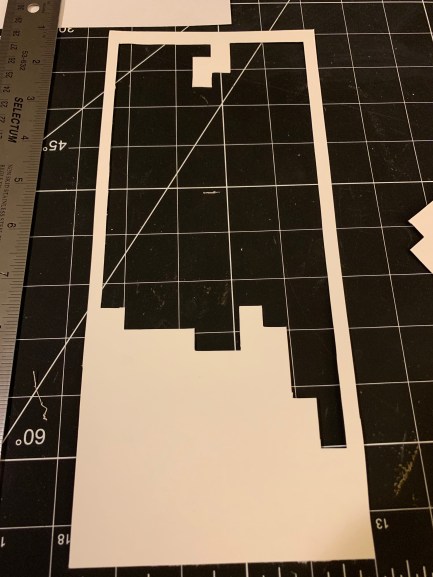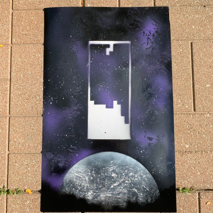 Then came the Tetris stencil. My vision was to create a galaxy painting inspired by the game Tetris Effect, where the board is essentially floating in space. This shape would have worked much better in the style of option 2, but I made it like option 1. More on that later.