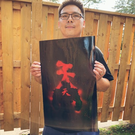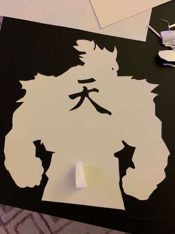 My vision was to create a silhouette of Akuma standing in front of the heaven symbol. Also wanted to spatter blood throughout. I ended up murdering my first attempt at this painting.