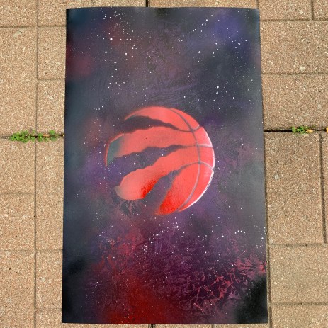 With the Toronto Raptors logo, it had to exist as the 2nd option, as you can’t really cut the original design to work in the same way that Akuma does. Though I thought I messed up by cutting this way, this actually proved to be the right way to do it. I would spray the galaxy first, then the logo on top. This allowed the galaxy to peer through the lines of the ball and the claw marks.