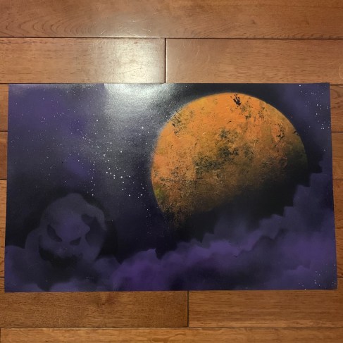 First, I started with the galaxy. Spraying in a combination of black, purple, and red, I used a mix of the team’s current and classic colours to create the backdrop. Tried my best to create textures with magazine paper and plastic bags, but the hot weather dried my paint much faster than expected. The effect is subtle because of that, but I’m good with the end result.