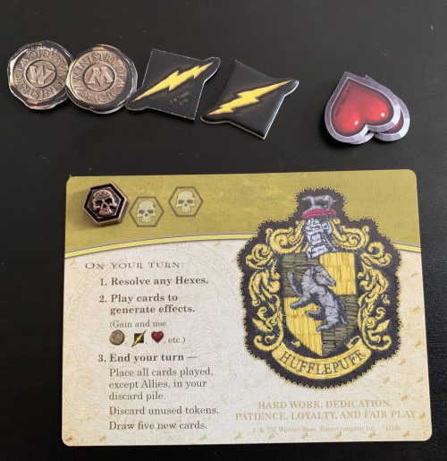 However, there are a few new wrinkles that I appreciate. Having tokens to represent your resources is a really nice touch. Being able to hold three hearts is a lot more convenient than reading through every card you played and adding up each reference to a heart. Using the board as a scoring track of sorts is also a clever touch. Combined with the theme and the tokens themed after each house, it kind of does feel like you’re in a battle, trying to push your opponents off the board.