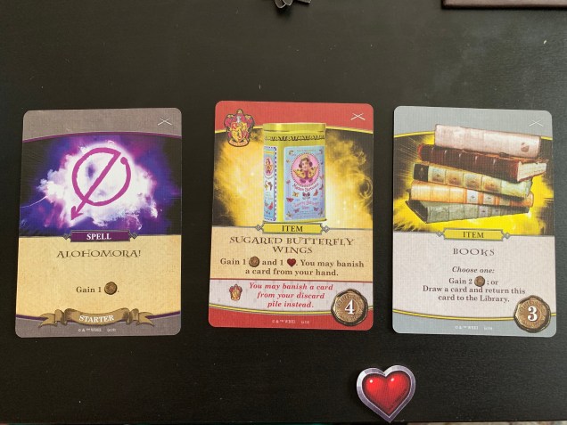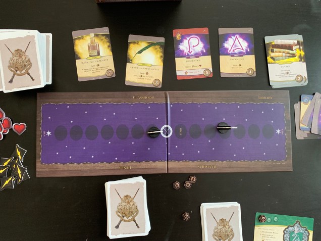 In this two-player deck-building game, each player receives a starting hand of 10 cards. This mix of spells, items, and an ally are used to help you generate one of the game’s three resources: Influence, Attacks, and Hearts. Influence helps you add new spell, item, and ally cards to your deck from the classroom or library. While books are cheap, some items are quite expensive, and adding Harry Potter to your deck is going to cost a fortune. Spend wisely!
