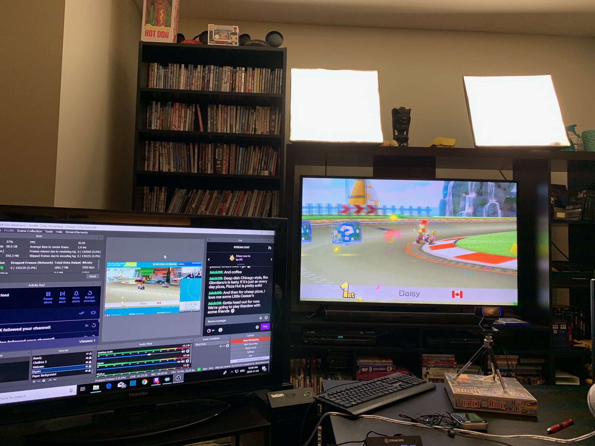 For 25 hours, our living room was covered in streaming equipment. From studio lights on top of our TV unit, to the webcam on my coffee table, to the big screen TV on our left-hand side used primarily for monitoring the chat, all of this gear was in service of bringing you into our living room. With an extra dose of Discord, we were able to get Kris, Rachel, and Jason on stream with us. Together, we aimed to inspire others to support the cause by donating, spreading the word, engaging with us through the chat, or even just lurking. The more that viewers tuned in, the higher we would appear in the Twitch directory, which made it easier for others to find the channel and hopefully join our movement.