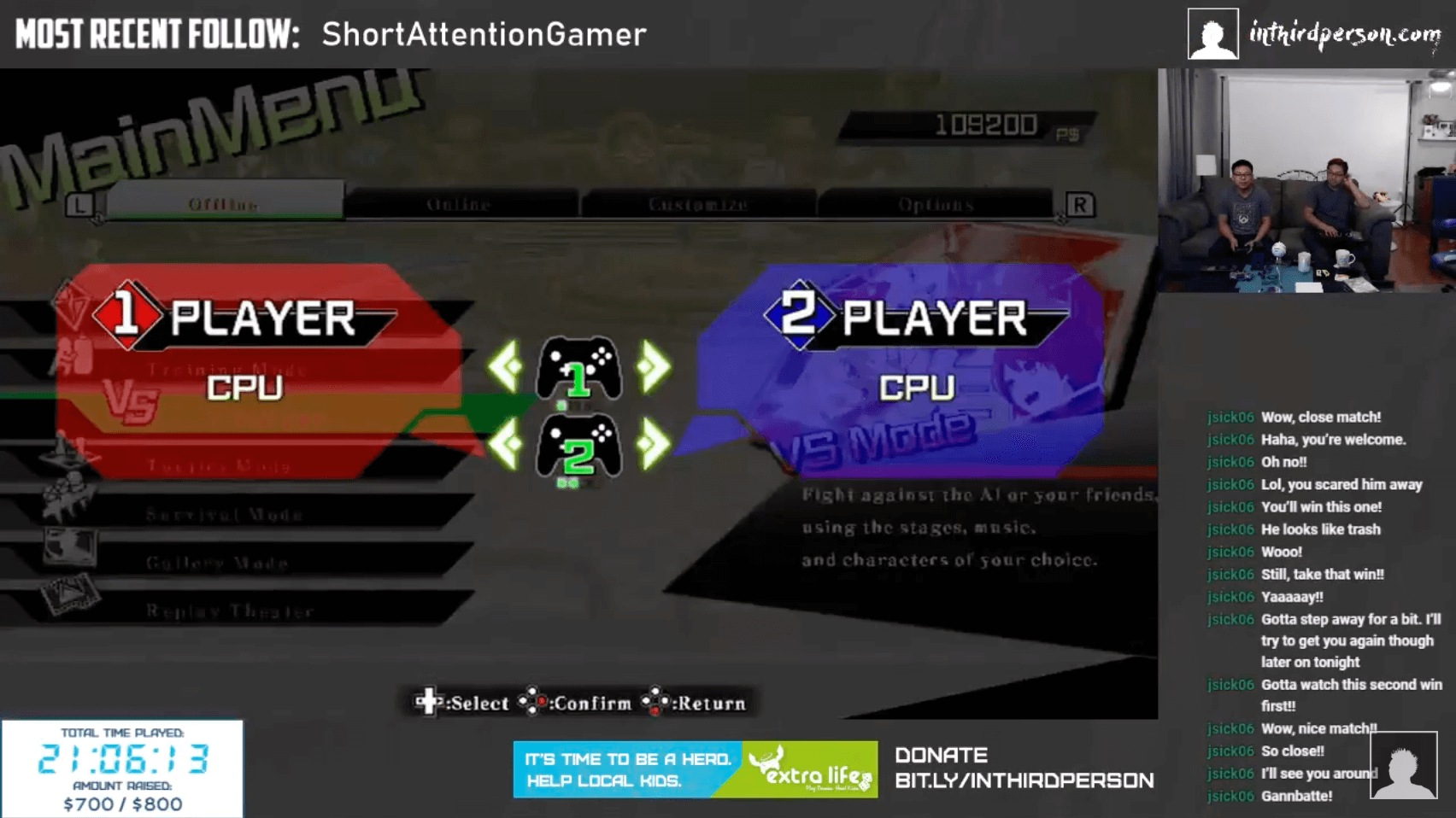 This adjustment worked wonders. Not only was it possible for me to easily see the chat while still on camera, it was now possible for everyone on the couch to follow along. I get the sense that everyone involved got more invested in the show because they could see and respond to viewers watching them. One of the truly amazing things to come out of this event was that we had viewers for the entire 25 hour run. Providing everyone on the couch with the ability to read the chat may have gone a long way towards us keeping things exciting for our viewers.