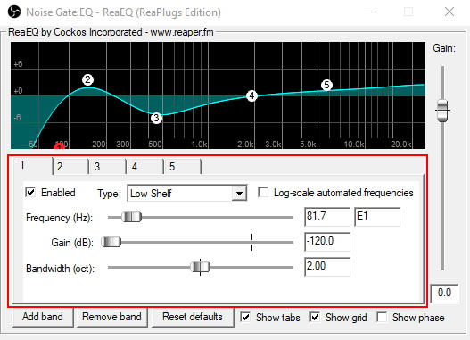 As a starting point, feel free to copy my exact settings. They’re highlighted above in the red boxes. Enter them in order of 1-5. By default, the EQ gives you four bands. You will need to “Add band” to get the fifth setting in there.
