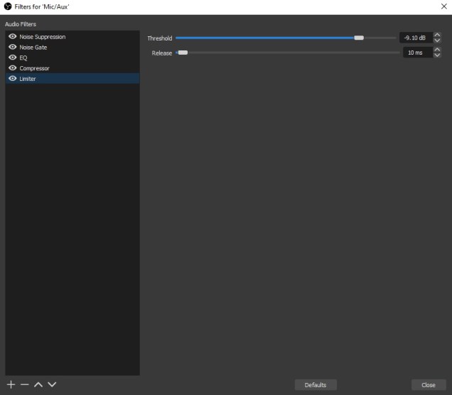 The Threshold setting determines the “ceiling” of your sound while the Release determines how long the ceiling will hold before letting go. For release time, you probably want something between 10 and 100ms. If you want, you can use the exact settings I have above. However, I would tweak the values in order to find a combination that allows your voice at its highest moments to stop just short of 0dB. Talk loudly into the mic as you adjust the values until you get the right combination.