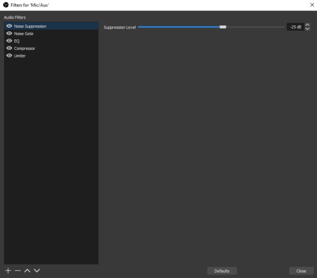 7. Go back to the “+” symbol and add a Noise Gate. This is meant to remove subtle noises, such as alarm clocks going off in an adjacent room, breathing, and other distractions. Focus on the Close Threshold and Open Threshold options. What you want to do is talk at the quietest level you would realistically talk while on stream and adjust the Close Threshold meter. Keep talking at that level and raising the Close Threshold until your voice starts to cut out. Then bump up your dB by a few decibels and set the Open Threshold to a level a bit above the Close Threshold.
