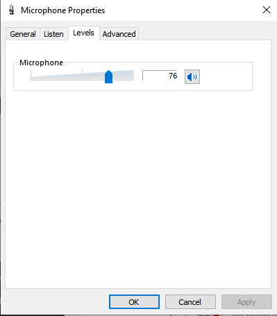 2. In the “Microphone Properties” menu, select the “Levels” tab and make sure the mic is set to somewhere between 70 and 80%.