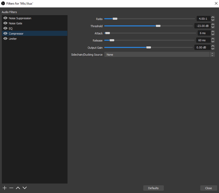 10. Go back to the + and add a Compressor. This filter is incredibly important, as it raises the volume during your quieter moments and limits the volume during your loudest moments. What you end up with is a more consistent mic output that won’t distort and will be easier to mix with other audio sources. You can copy my settings above, but ideal settings will be dependent on your voice, your mic, and the room you’re in. Follow these steps to tune it for your situation: