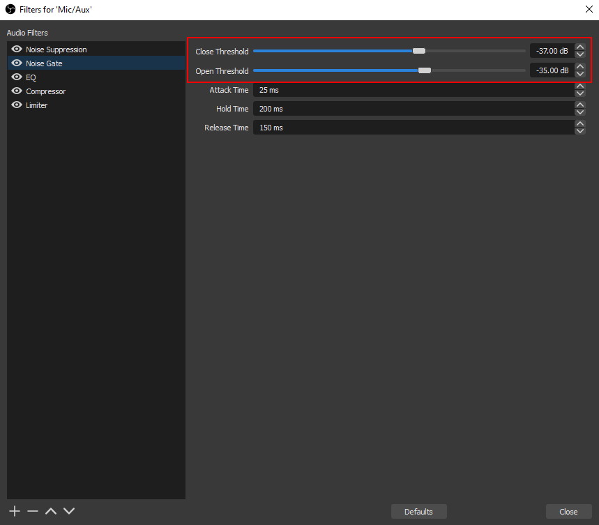 7. Go back to the “+” symbol and add a Noise Gate. This is meant to remove subtle noises, such as alarm clocks going off in an adjacent room, breathing, and other distractions. Focus on the Close Threshold and Open Threshold options. What you want to do is talk at the quietest level you would realistically talk while on stream and adjust the Close Threshold meter. Keep talking at that level and raising the Close Threshold until your voice starts to cut out. Then bump up your dB by a few decibels and set the Open Threshold to a level a bit above the Close Threshold.