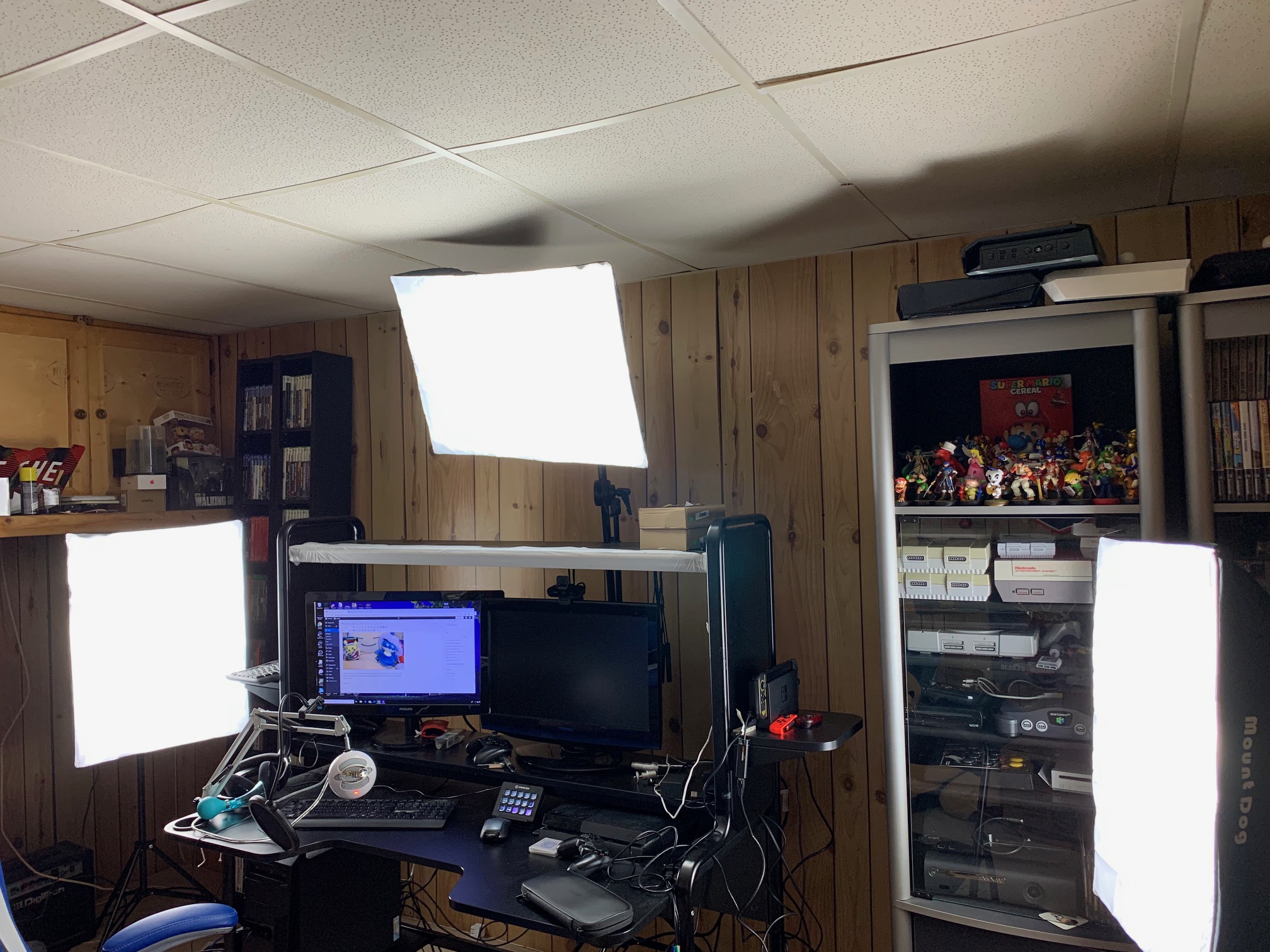 I then got a pair of hand-me-down studio lights from my cousin. They didn’t come with stands and one of them actually wasn’t mountable due to the connector being broken. Aiming them directly at my face seemed to completely wash me out. Because of this, we aimed the lights at the ceiling using chairs and old moving boxes as stands. Would eventually discover that this approach to lighting was completely wrong and only “worked” due to my camera’s Low Light Compensation. Really should have pointed them at my face and turned that feature off.