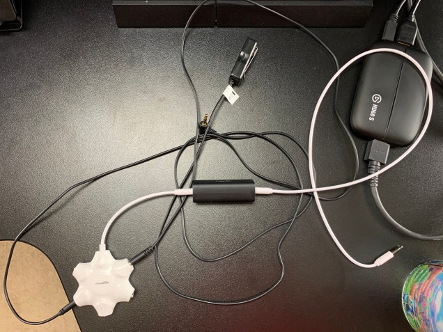 As an alternative, you can cobble together your own variation of this solution with Amazon Basic parts, which I’ve also done and pictured above. This picture also shows the ground loop in the middle, which is used to remove the buzzing sound when you try and connect to the Switch’s headphone jack in docked mode, and the volume control at the top that allows me to adjust my headphone volume independently of what goes into the PC.