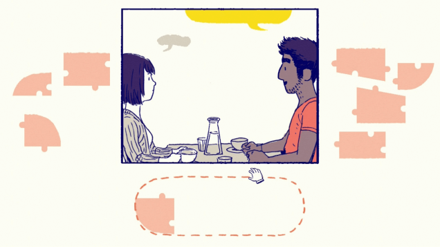 Each chapter cleverly uses gameplay mechanics to illustrate the thoughts and feelings of each moment. For example, early on in their relationship, dialogue bubbles are pieced together like a puzzle. As the relationship strengthens, there are fewer pieces to put together. This mechanic continually evolves to demonstrate what they’re saying and how they’re feeling without displaying a single word.