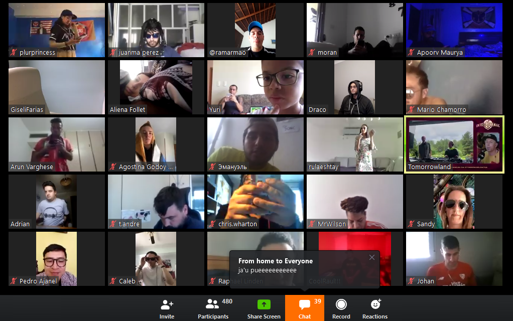 What’s happening in the background is a public Zoom conference call that anyone can join. From here, you can hear the DJ spin while dancing along to the music. Someone on Tomorrowland’s end is screening viewers and showcasing different viewers every few seconds.