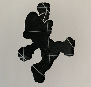 Mario leaps across the galaxy in this “negative” art. Most of the time, space is depicted with black paint. Taking a cue from Skech Art, I tried my hand at inverting the colours. Then I had the idea of taking it in a slightly different direction by depicting Mario in red, jumping between two planets.