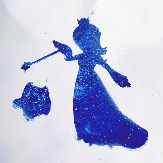 The trick to this one is that I had to paint the space that Rosalina and Luma would reside in first. After creating my blue-and-white blob, I put the stencils on top and painted everything white. Finally, I peeled off the stencils to reveal Rosalina and Luma preserved underneath.