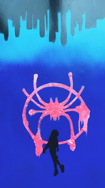 Miles Morales dives into the Spider-Verse in this next painting. Taking my own twist on its promotional art, I substituted all of the pieces with components that I could make work as a spray paint piece.