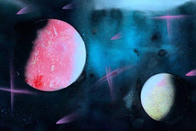 Last but not least was a wholly-original piece. Starting with two planets, I spiced things up with my first decent attempt at glistening stars and streaking comets. Was originally aiming for the teal to spiral outward, but I learned the hard way that this particular can blasts with a very wide radius. No matter, it’s simply part of the galaxy now.