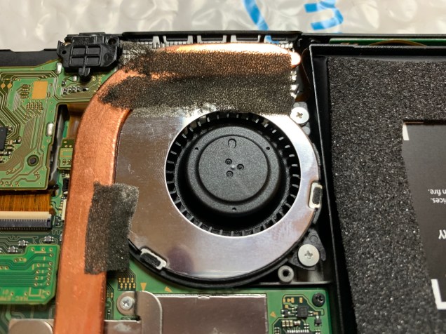 Unfortunately, I did not get a good picture of this next step. After removing the two screws, you’re going to need to twist this board to the side a bit. Underneath is the third screw holding the fan. Carefully twist the board, allowing the ribbon to bend a bit, and remove the screw.