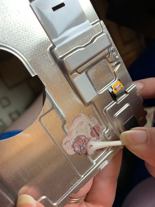 Before we put the metal plate back on, make sure to clean off the old thermal paste on it.