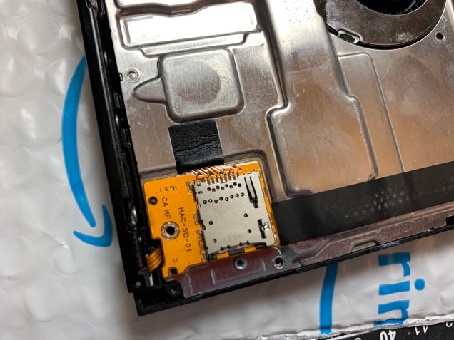 Reconnect the micro SD card slot to the board by pushing the black foam piece into the motherboard. You should feel a click. Then screw it in.