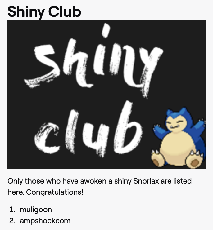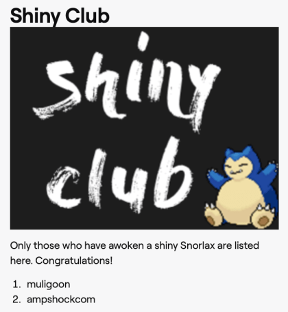Not long after I came up with this pie-in-the-sky idea, I found this randomization guide by Neverwho. Though it’s a bit messy to set up and the developer has stated that there a future update will make randomization easier, I was able to follow this guide and re-weigh the randomization to my liking. I turned to Pete again for the animation and now Snorlax regularly jumps on my screen, as viewers hope to reveal a shiny and have their names permanently displayed in my Shiny Club. Additional catches will also be rewarded, allowing those with multiples to have an extra level of bragging rights.