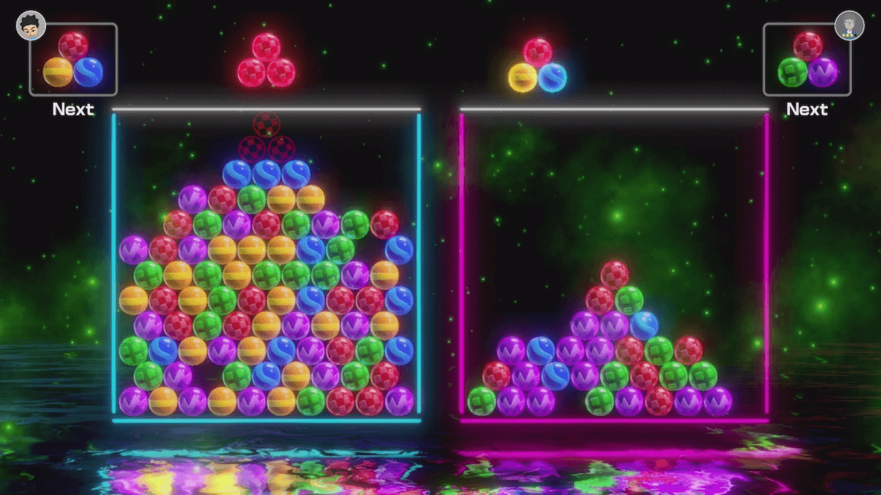 6-Ball Puzzle is essentially a mix of Tetris and Bust-A-Move. Connect six balls to clear them from your board. Strings larger than six or clears in specific formations will send junk balls to your opponent. The player whose balls don’t touch the top of the board wins! With a few more features, this could easily be sold as a standalone game on the eShop. It’s a nice value add in Clubhouse Games: 51 Worldwide Classics!